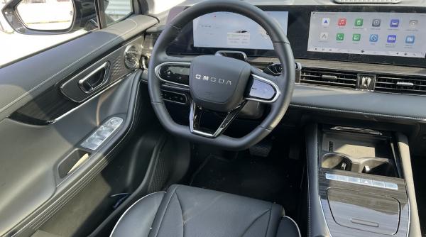 Prima ciudățenie apare din momentul în care te sui în Omoda 5 EV, pentru că nu există buton de pornire, evident, nici de oprire. Ca să pleci de pe loc, trebuie să ai cheia la tine, să-ți pui centura și să o bagi în drive din maneta care este în dreapta volanului, la mașinile cu care suntem obișnuiți fiind folosită pentru ștergătoare. Nu se mișcă dacă nu ți-ai pus centura, la fel ca și fratele pe benzină. La oprire, la fel, trebuie să pui mașina în modul parking, apăsând un buton care este situat în capătul manetei schimbătorului. Ai ieșit din mașină, ai plecat cu cheia la tine, iar ea se va închide automat. Mai rămân de control luminile de urmărire, dar și starea lor poate fi setată. Spre deosebire de varianta pe benzină, mașina electrică are un motor mai puternic, de 204 cai. Are trei moduri de condus: Eco, Normal și Sport și are un sprint până la sută de 7,6 secunde, ceea ce o face foarte sportivă. Cuplul maxim este de 340 Nm, cu 70 Nm față de cea pe benzină, dar viteza pe care o poate atinge este de 172 km/h, cu 30 de km/h mai puțin. Dar asta înseamnă că este mult mai rapidă în trafic decât sora ei pe benzină.