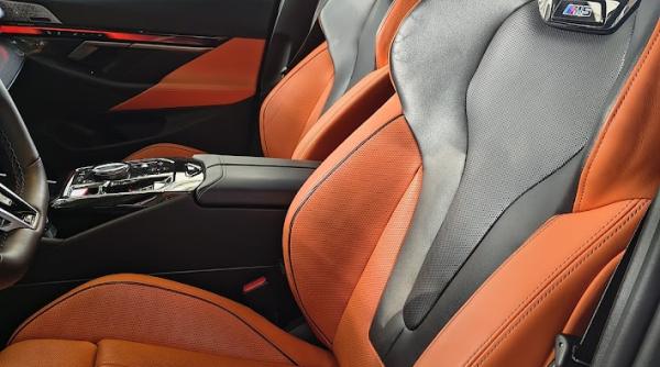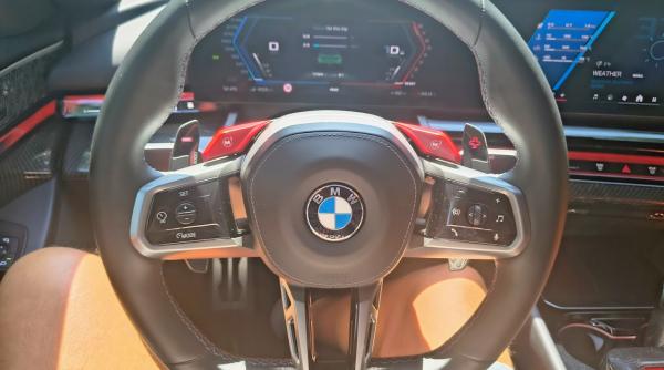 Din momentul în care deschizi portiera noului M5, ești întâmpinat de o atmosferă care te învăluie într-un amestec de lux și sportivitatea. Nu este doar un loc unde stai, ci un spațiu conceput pentru a te integra perfect în experiența de condus. Scaunele M Sport, învelișuri în piele Merino fină, sunt adevărate opere de artă inginerească. Oferă un suport lateral impecabil, esențial în virajele abordate cu entuziasm, dar și un confort suprem pentru drumurile lungi. Reglajele sunt infinite, de la suportul lombar și lateral, până la lungimea șezutului, asigurându-te că găsești poziția perfectă, indiferent de statura ta. Ventilația și încălzirea scaunelor sunt salvatoare în zilele caniculare sau geroase. Volanul M din piele, gros și sportiv, se simte natural în mâini, iar butoanele M1 și M2, personalizabile, sunt plasate pe volan în dreptul degetelor mari. Nu mai există ca la celelalte versiuni moduri presetate de Comfort, Sport, Eco. La M5, ai cele două butoane roșii care îți permit să setezi mașina în 2 moduri dorite de tine. Materialele sunt de cea mai înaltă calitate. Fibra de carbon lucioasă se îmbină armonios cu aluminiul satinat. Fiecare detaliu este finisat cu o precizie obsesivă, de la cusăturile contrastante până la iluminarea ambientală subtilă, care creează o atmosferă personalizată seara. Spațiul este, de asemenea, generos. Fiind un sedan de clasă mare, pasagerii din spate beneficiază de un spațiu suficient pentru picioare și cap, chiar și pe distanțe lungi. Și nu trebuie să stea cu picioarele la gură pentru că bateria plasată sub podea coboară centrul de masă fără o supraînălțare. Portbagajul rămâne practic și suficient pentru bagajele unei familii pentru un weekend prelungit. M5 are cu BMW Curved Display: un ecran digital imens, cuprinzând panoul de bord și sistemul multimedia, curbat spre șofer ca o plecăciune. Navigația funcționează impecabil, hărțile sunt 3D, răspunde la comenzi vocale, iar sistemul de operare iDrive 8.5 este mai intuitiv decât unele smartphone-uri. Ai control prin touchscreen, prin rotiță haptică, prin gesturi, prin voce. Poți regla temperatura, schimba muzica, configura ambientul sau cere restaurantul cel mai apropiat unde nu se cântă manele – totul cu un „Hey, BMW”. Iluminarea ambientală nu e doar o chichiță de design, ci o experiență cromatică complet configurabilă. Poți alege între 15 combinații de culori care transformă cabina într-un bar de jazz futurist, o galerie de artă sau un sanctuar personal. La apus, cu lumina albastră subtilă și sunetul de la Bowers & Wilkins pornit, interiorul M5-ului nu mai e interior. E un spațiu Zen. Sistemul audio are 1400W cu 16 difuzoare dispuse strategic în caroserie, marca Bowers & Wilkins Diamond Surround System. Cât despre prețul unei astfel de bijuterii bavareze, ajunge undeva la 160.000 de euro cu TVA.