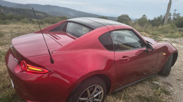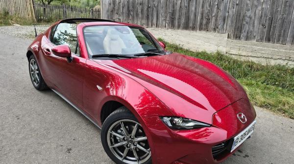 Există mașini care se laudă cu cifre, cu grafice de consum, cu tehnologii futuriste și cu ecrane care îți iau ochii. Și există mașini care nu au nevoie de nicio prezentare complicată, pentru că primul contact cu ele îți dă o stare pe care nicio cifră nu o poate explica. Mazda MX-5 RF face parte din a doua categorie. Este o mașină care te lovește direct în stomac cu emoție pură, fără artificii, fără să încerce să fie mai mult decât e. Într-o lume dominată de SUV-uri tot mai mari și mai grele, cu interioare care seamănă mai mult cu un iPad lipit pe un bord, Mazda vine și aruncă pe masă un roadster mic, ușor, care cântărește abia 1000 kg. Și, paradoxal, fix asta îl face să pară mai proaspăt ca niciodată. MX-5 RF nu e o mașină de mers la birou, ci o scuză perfectă să pleci de la birou.