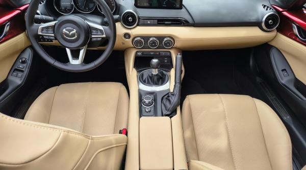 Intrarea în habitaclul MX-5 RF e ca o călătorie în timp. În locul unei planșe pline de ecrane, butoane tactile și meniuri complicate, te întâmpină un bord simplu, aproape nostalgic. Ai butoane fizice, rotative, așezate exact acolo unde trebuie. Dacă ești genul crescut în anii ’90, aproape că aștepți să vezi un radiocasetofon clasic cu butoane cromate. Și e un lucru bun. Pentru că tot ce vezi, tot ce atingi e gândit să fie ușor, intuitiv și direct. Nu pierzi minute bune căutând prin meniuri modul de dezaburire. Nu te ia amețeala de la lumini albastre și animații inutile. Aici e totul old-school. Și fix asta face parte din farmec. Mazda nu vrea să-ți distragă atenția cu gadgeturi. Vrea să te concentrezi pe drum, pe volan și pe motor. Atmosfera de la bord e una de mașină clasică reinterpretată modern, și în fiecare detaliu simți intenția asta. Are doar două locuri, pentru că nici nu și-ar avea sensul mai multe. Mazda MX-5 RF e o mașină egoistă, dar într-un sens bun. Este pentru tine și pentru persoana pe care o alegi să o aduci cu tine. Nu pentru prieteni, nu pentru copii, nu pentru rude. Doar pentru voi doi. Această limitare devine, paradoxal, un atu. Îți dă senzația că tot spațiul, tot sunetul motorului, tot drumul e doar al vostru. E un fel de bulă în care te izolezi de restul lumii. Torpedoul e în spatele scaunelor și se poate închide cu cheia. Acolo încap niște acte ale mașinii și cel mult un portofel. Tot în spatele scaunelor sunt și suporturile pentru pahare. Portbagajul? Mic, dar surprinzător. Poți să bagi două trolere de weekend, niște rucsacuri și cam atât. Adică exact cât îți trebuie pentru o fugă la mare, o ieșire romantică la munte sau un city break improvizat. Nu vei duce niciodată un frigider în el. Dar vei duce libertatea. Și asta valorează mai mult. Un detaliu genial: sistemul audio Bose cu difuzoare în tetiere. E soluția prin care Mazda s-a asigurat că nu pierzi plăcerea muzicii chiar și atunci când mergi cu plafonul coborât pe autostradă. Rezultatul e incredibil: vântul șuieră pe lângă urechi, dar în același timp vocea cântărețului preferat îți ajunge perfect clar. E un mic lux ascuns într-o mașină care, altfel, e foarte simplă. Și fix detaliile astea fac diferența dintre o mașină „ok” și una pe care o iubești. Tot de scaune sunt prinse și centurile de siguranță.