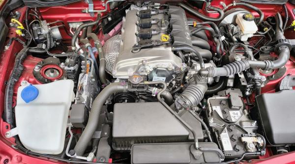 Povestea MX-5-ului nu e despre cai putere. Și totuși, motorul de 1.5 litri SkyActiv-G merită toată atenția. Cu 132 CP și 152 Nm, nu e cel mai puternic propulsor din lume. Dar, pe cei puțin peste 1.100 kg, mașina zboară cu o agilitate care face multe hot hatch-uri să roșească. Ceea ce te cucerește nu sunt cifrele, ci felul în care sună și reacționează. La pornire, ai un huruit gutural, autentic, aproape visceral. Nu e sunet falsificat prin boxe. E mecanic pur, transmis direct de eșapament. Pe măsură ce turezi motorul, sunetul devine o simfonie de metal care îți spune clar: „Aici ești șofer, nu pasager.”. Pe asfalt, reacția motorului e instantanee. Apeși accelerația și simți cum fiecare centimetru de cursă al pedalei îți mută greutatea corpului în scaun. E un răspuns pur, fără turbo lag, fără artificii electronice. Evident pe un roadster atât de clasic, o cutie automată poate părea o blasfemie. Așa că transmisia este una manuală, în șase trepte. Bine dirijată te ajută să atingi suta în 8.6 secunde și o viteză maximă de 203 km/h care-ți face părul măciucă, la propriu. Schimbarea treptelor e atât de satisfăcătoare, încât te trezești schimbând viteza chiar și când nu e nevoie, doar pentru plăcerea gestului. Distribuția de greutate aproape perfectă 50/50 și masa redusă îți dau senzația că mașina dansează cu tine în curbe. Nu te forțează, nu te sperie, ci îți arată constant unde e limita și te lasă să te joci acolo, pe muchie. Partea care face din MX-5 RF un adevărat cult sunt senzațiile. Ești atât de jos, încât ai impresia că mergi cu fundul pe asfalt. Vezi roțile mașinilor din jur mai mari decât capota ta. Fiecare denivelare ți se transmite în șezut, fiecare viraj îți încordează brațele. Pe drum virajat, MX-5 RF e ca un partener de dans. Intră în curbe cu o precizie de bisturiu și iese din ele cu un balans perfect controlat. Direcția e scurtă, comunicativă, fiecare mică mișcare a volanului fiind simțită imediat în roți. Suspensia nu e moale, dar nici brutală. Este exact atât cât trebuie ca să simți asfaltul, dar fără să te zdruncine inutil. Ai feedback permanent, dar într-un mod plăcut. Pe autostradă, cu plafonul jos, vântul devine parte din experiență. Nu e o problemă, e un ingredient. Și culmea, cu tot zgomotul, nu e obositor. Pentru că mașina nu te lasă să fii pasiv. Te ține conectat în permanență.