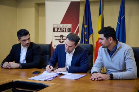 Ciprian Șerban – Ministrul Transporturilor, George Tuță – Primarul Sectorului 1 și Vlad Andronescu – Directorul CS Rapid au semnat protocolul de colaborare pentru finanțarea modernizării, reabilitării, extinderii și dotării bazei sportive Pro Rapid.