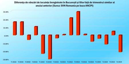 Cele mai slabe luni pentru vânzările de locuințe din 2025 înregistrate în București și împrejurimi, regiune în care se tranzacționează pentru o treime din locuințele vândute anual în România, au fost aprilie, cu un minus anual de 25% - într-un context în care în luna aprilie a acestui an a fost o perioadă de concedii prelungite prilejuite de sărbătorile Pascale și vacanța de 1 mai – și în luna decembrie, cu o scădere a vânzărilor de 24% față de decembrie 2024.