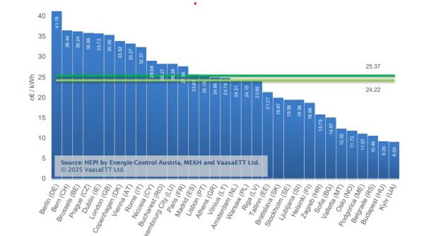 Potrivit Indicelui prețurilor energiei casnice pentru Europa (Household Energy Price Index for Europe) publicat de Eurostat, în luna august bucureștenii au plătit în medie un preț de 28,27 euro/KWh, fiind imediat sub locuitorii Nicosiei (Cipru) care au plătit 28,28 euro/kWh, și puțin peste locuitorii din Luxemburg City, care au avut un preț mediu de 28,26 euro/kWh. Dacă este să ne raportăm la capitalele țărilor din Europa de Centrală și de Est, Bucureștiul le bate pe toate la preț. De altfel, bucureșteni au prețuri mai mari chiar și comparativ cu multe capitale ale țărilor occidentale, precum Paris, Madrid, Amsterdam etc.