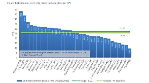 Atunci când sunt ajustate la standardele puterii de cumpărare (purchasing power standard - PPS) din fiecare țară, imaginea se schimbă dramatic. Astfel, prețurile la energie electrică duc consumatorii finali din Bucureștiul pe primul loc în topul celor mai scumpe energii. Cu un preț mediu de 48,23 PPS/100 kWh, Bucureștiul surclasează celelalte capitale ale Europei. Pe locul doi a fost Praga cu 43,81 PPS/100 kWh, iar pe poziția a treia s-a plasat Berlinul cu 36,88 PPS/100 kWh. În timp ce bucureștenii au acces la o energie extrem de scumpă raportată la puterea lor de cumpărare, locuitorii Budapestei au acces la una dintre cele mai ieftine energii din Europa. La un preț ajustat la puterea de cumpărare, locuitorii Budapestei au un preț mediu de 13,19 PPS/100 kWh, al doilea cel mai ieftin din Europa, în condițiile în care locuitorii Oslo, capitala Norvegiei, au un preț de 9,47 PPS/100 kWh. Majoritatea țărilor din Europa Centrală și de Est ajung de obicei la prețuri la energia electrică relativ scăzute în comparație cu nivelul general al prețurilor din țară și sub media europeană. București, Praga, Riga, Vilnius și Varșovia sunt singurele capitale dintre țările din Europa Centrală și de Est în care prețul energiei electrice a fost peste media europeană în august 2025. Trebuie să mai spunem că România avea deja, chiar și cu prețuri plafonate la energie, printre cele mai mari prețuri din UE - 32,69 PPS/ 100 KWh.