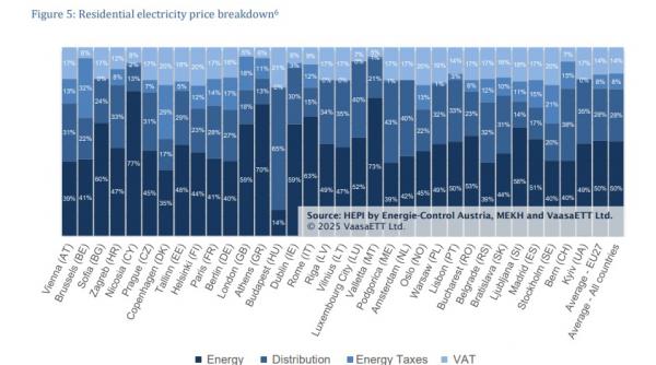 Defalcat, pe componentele care formează prețul final al energiei electrice facturate clienților rezidențiali din capitalele Europei, prețul efectiv al energiei electrice în august reprezintă în medie 50% din acesta, 28% este tariful de distribuție, 8 taxele pe energie și 14% TVA-ul. În București, costul efectiv al energiei electrice este de 53% din costul facturii, ceea ce ne arată că este scumpă, în timp ce restul reprezintă tariful de distribuție și taxele. Sub această medie se plasează de exemplu Budapesta, unde costul energiei electrice în factura finală este de doar 14%, ceea ce ne arată că la vecinii noștri prețul energiei electrice ca marfă este mic, în timp ce la Nicosia ajunge la 77% din prețul facturii pentru utilizatorul final. De exemplu, la Sofia prețul energiei electrice reprezintă 60% din factură, la Varșovia 49%, la Belgrad 39%, la Praga 45%, la Bratislava 44% etc.