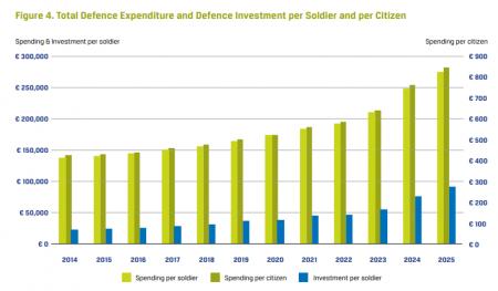 - În 2024, cheltuielile totale de apărare per personal militar activ au atins un record de 249.000 de euro, în creștere de la 211.000 de euro în 2023 și semnificativ mai mult decât cei 138.000 de euro cheltuiți în 2014.