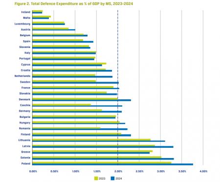 - În 2024, 24 de state membre au atins pragul de 20% pentru investițiile în apărare, în creștere de la 20 în 2023, o tendință accelerată, deoarece țările direcționează o pondere din ce în ce mai mare din cheltuielile lor către investiții.