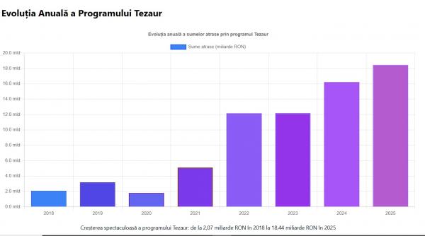 O nouă emisiune de titluri de stat Tezaur a fost lansată ieri de către Ministerul Finanțelor. Populația va putea cumpăra titluri până pe data de 5 februarie. Titlurile de stat sunt cu maturități de 1, 3 și 5 ani și dobânzi anuale de 6,40%, 7,00%, respectiv, 7,40%. În ultimii ani, titlurile de stat Tezaur și Fidelis au devenit o supapă pentru statul român, care a accelerat împrumuturile. Până la începutul lunii decembrie a anului trecut, statul a obținut prin intermediul acestor emisiuni peste 47 miliarde de lei, ceea ce a reprezentat 30% din finanțarea internă, un record pentru Ministerul Finanțelor. Suma va fi însă ceva mai mare, pentru că în decembrie au mai fost lansate două emisiuni Tezaur și Fidelis, iar datele făcute publice pentru titlurile Fidelis arată că ele au atras 1,49 miliarde de lei. Pentru anul 2026, Guvernul Bolojan vrea să ridice miza și să obțină 60 de miliarde de lei.