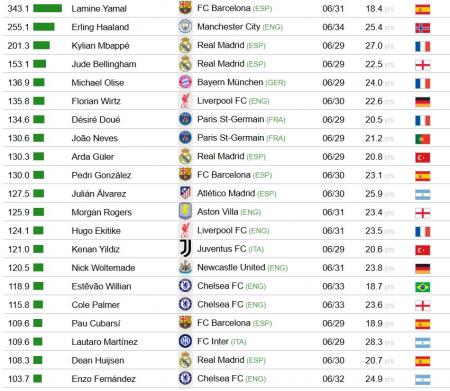 În top 10 cei mai valoroși jucători se află doi francezi: Michael Olise (locul 5, 136,9 milioane de euro) și Désiré Doué (locul 7, 134,6 milioane de euro), acesta din urmă devansându-l pe colegul său de la PSG, João Neves (locul 8, 130,6 milioane de euro).