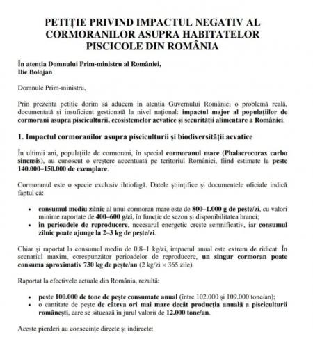 Raportat anual, un singur cormoran poate consuma până la 730 kg de pește, iar la nivel național rezultă un consum cumulat de peste 100.000 de tone de pește pe an, conform calculelor incluse în document. Prin comparație, producția anuală a pisciculturii românești este estimată la aproximativ 12.000 de tone, ceea ce evidențiază un dezechilibru structural între consum și capacitatea de producție, se arată în petiția transmisă oficialilor.