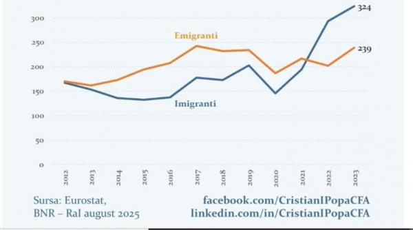 „Revenind la migrație, după mai bine de două decenii de migrație net negativă, România a trecut pe plus în 2022–2023. Asta nu înseamnă că toți românii s-au întors acasă sau că au încetat să mai plece, dar fenomenul s-a temperat, au început să mai și revină acasă. În medie, au emigrat (plecat) peste 200.000 de persoane anual în ultimii 10 ani. Dar, în 2023, România a avut circa 324.000 imigranți (persoane sosite). Două mecanisme au contribuit: majorarea și menținerea din 2022 a contingentului anual de lucrători non-UE la 100.000 și revenirea unei părți a diasporei după pandemie”.