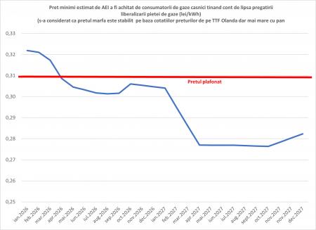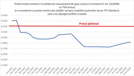 Vom estima evoluția prețurilor gazelor naturale la consumatorul final. Pentru asta s-a considerat că prețul gazului marfă este cel stabilit pe baza cotațiilor prețurilor futures de pe TTF Olanda în următorii 2 ani, la care s-au adaugat tarifele, taxele și marja comercială care s-au considerat că vor rămâne constante în ultimii 2 ani (de asemenea s-a considerat că nu vor fi alte influențe: crize, conflicte etc.). În baza acestei estimări prețul gazelor naturale la populație ar trebui să scadă cu 5% față de prețul plafonat în anul 2026 și de 11% în anul 2027.