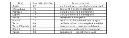 - Câmpulung (AG): colapsul ARO (faliment 2006) + scădere populație 2011→ 2021 (27.574 loc.); proximitatea A1 nu a înlocuit platforma industrială. Risc: ridicat.