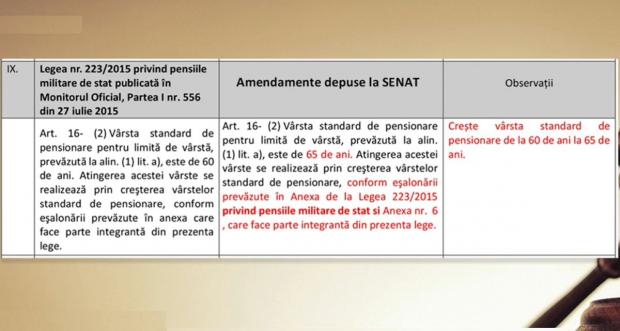 "Art. 16 - (2) Vârsta standard de pensionare pentru limită de vârstă, prevăzută la alin. (1) lit. a), este de 65 de ani. Atingerea acestei vârste se realizează prin creşterea vârstelor standard de pensionare, conform eşalonării prevăzute în Anexa de la Lege 223/2015 privind pensiile militare de stat şi Anexa nr. 6 care face parte integrantă din lege", se arată în amendamentul depus la Senat.