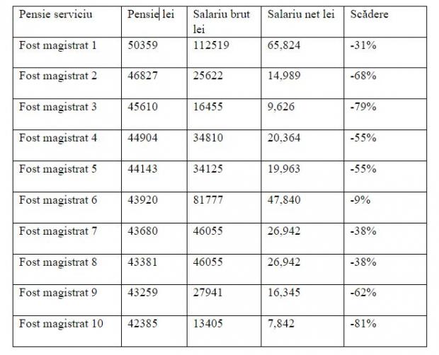 Propunerea legislativă prevede ca veniturile foștilor magistrați să scadă, cea mai mare cu 31%, următoarea cu 68% iar cea de pe locul trei va fi cu 79% mai mică, scrie antena3CNN. Există și pensii speciale cărora li se aplică o reducere de numai 9%, și asta pentru un cuantum de 47.840 de lei!