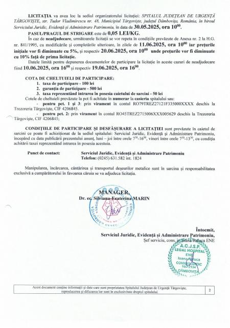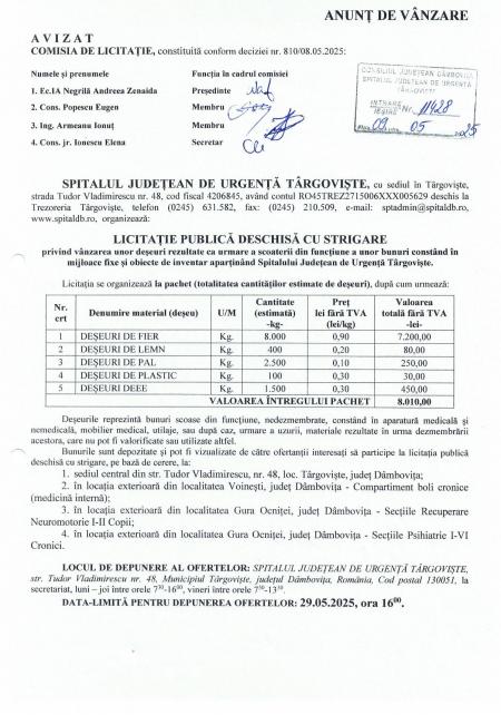 SPITALUL JUDEȚEAN DE URGENȚĂ TÂRGOVIȘTE, cu sediul în Târgoviște, strada Tudor Vladimirescu nr. 48, cod fiscal 4206845, având contul RO45TREZ2715006XXX005629 deschis la Trezoreria Târgoviște, telefon (0245) 631.582, fax: (0245) 210.509, e-mail: sptadmin@spitaldb.ro, www.spitaldb.ro, organizează: