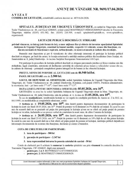 LICITAȚIA va avea loc la sediul Spitalului Județean de Urgență Târgoviște situat în Mun. Târgoviște, str. Tudor Vladimirescu nr. 48, județ Dâmbovița, sala de ședințe, et. 6, în data de 11.05.2026, ora 1000.
