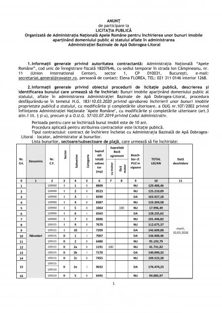 - Informații generale privind obiectul procedurii de licitație publică, descrierea și identificarea bunului care urmează să fie închiriat: Bunuri imobile aparținând domeniului public al statului, aflate în administrarea Administrației Bazinale de Apă Dobrogea-Litoral, procedura desfășurându-se în temeiul H.G. 183/10.03.2020 privind aprobarea închirierii unor bunuri imobile proprietate publică a statului, cu modificările și completările ulterioare, a OUG nr.107/2002 privind înfiinţarea Administraţiei Naţionale "Apele Române", cu modificările și completările ulterioare (art.3 alin.1 lit. ţ și u), precum și a O.U.G. 57/03.07.2019 privind Codul Administrativ.