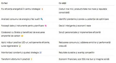În continuare, vei descoperi măsuri practice de eficiență energetică și recomandările Stratos, pentru ca afacerea ta să devină mai sustenabilă, mai competitivă și pregătită pentru viitor.
