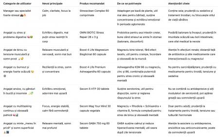 - Suplimentul nu înlocuiește o dietă variată, dar oferă sprijin eficient pentru reducerea efectelor stresului profesional.