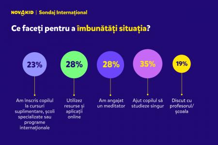 Pentru a îmbunătăți situația, adulții caută diverse alternative: 35% dintre persoanele chestionate preferă să își ajute juniorii să învețe singuri, 28% apelează la resurse și aplicații online, 28% angajează un meditator, 23% înscriu micuții la ore suplimentare, școli specializate sau programe internaționale, iar 19% discută cu profesorii problemele întâmpinate.