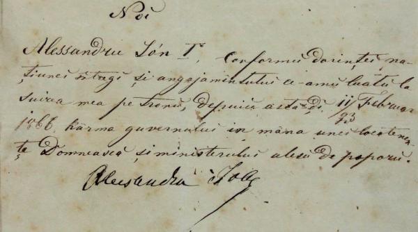 „Noi, Alassandru Ion I, conform dorinței națiunii întregi și angajamentului ce am luat la suirea pe Tron, depun astăzi, 11 februarie 1866, cârma guvernului în mâna unei Locotenențe Domnești și a Ministerului ales de popor.”, Alexandru Ioan Cuza