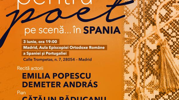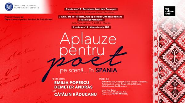 Actorii Emilia Popescu și Demeter András, împreună cu pianistul Cătălin Răducanu, vor duce poezia românească în mijlocul uneia dintre cele mai mari comunități de români din afara ţării prin spectacole care vor avea loc pe 2 iunie, ora 19:00, la Barcelona, Jardí dels Tarongers, pe 3 iunie, ora 19:00, la Madrid, Aula Episcopiei Ortodoxe Române a Spaniei si Portugaliei şi pe 5 iunie, ora 19:00, la Valencia, la The Westin.