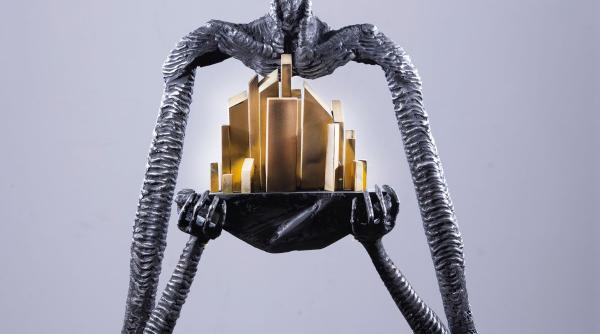 Casa de licitații care oferă intrare liberă pentru toate expozițiile – în galeriile Palatului Cesianu-Racoviță – a adus laolaltă cele mai importante nume din istoria recentă a artelor plastice. Și chiar sculptura „The Silent Guardian” realizată de Daniel Rădulescu, care a fost în centrul pavilionului românesc din cadrul Expoziției Mondiale, eveniment organizat doar o dată la cinci ani și care în 2025 a avut „capitala” pe insula Yumeshima din Osaka (Japonia). Realizată din straturi de oțel și cu un element deosebit, un „cartier rezidențial” din lingouri de alamă, lucrarea intră în licitația care are loc în data de 18 noiembrie, de la ora 17.00, atât la Galeriile Artmark, cât și online, pe Platforma Artmark Live, de la 10.000 de euro. Pot participa la eveniment toți cei care și-au făcut un cont de colecționar pe artmark.ro.