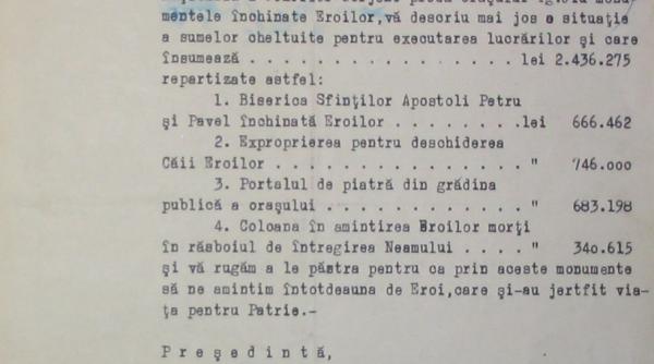 Arhivele Naționale prezintă, cu prilejul anului Brâncuși, câteva documente referitoare la marele sculptor. Le-am ales pe cele păstrate la Serviciul Județean Gorj, prin care Liga Națională a Femeilor Gorjene, a cărei președintă era Arethia Tătărescu, a pus la dispoziția municipalității, prin adresa înregistrată la primăria orașului cu nr. 7501 din 27 octombrie 1938, lucrările finalizate, raportând și sumele însemnate strânse pentru realizarea proiectului emblematic Calea Eroilor. Din acest ansamblu fac parte, de la est (pornind de la râul Jiu) spre vest: Masa Tăcerii, Aleea Scaunelor, Poarta Sărutului și Coloana fără sfârșit. Tot pe axul acestui ansamblu a fost edificată de municipalitate și o biserică, începută cu mulți ani înainte, dar care rămăsese nefinalizată, purtând hramul Sfinții Apostoli Petru și Pavel.