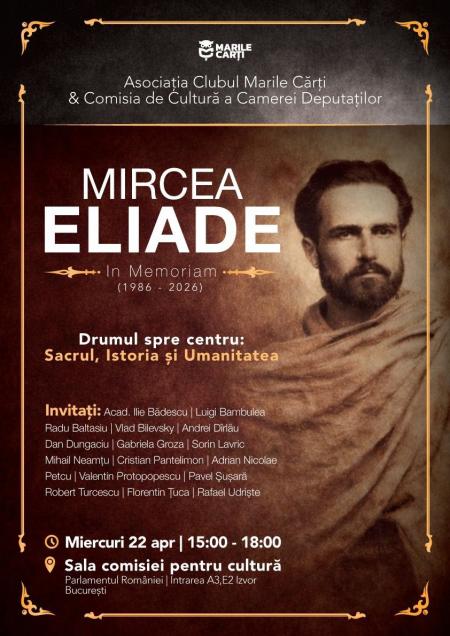 Intrarea este liberă, însă este necesară rezervarea unui loc gratuit accesând linkul: https://marilecarti.ro/events/eliade-in-memoriam-1986-2026-drumul-spre-centru/