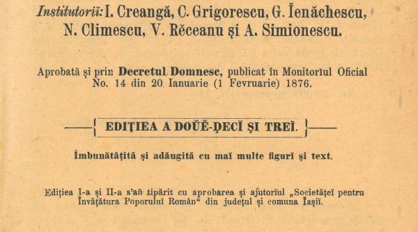 4. 1868, a apărut, la Iaşi, manualul lui Ion Creangă: „Metodă nouă de scriere şi cetire pentru usulu clasei I primariă” (titlul primei ediții), ce a avut 23 de ediții succesive!, până în 1893.