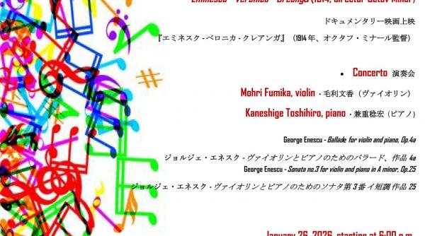 ICR Tokyo organizează luni, 26 ianuarie 2026, în Sala de festivități a Ambasadei României în Japonia, recitalul de muzică de cameră cu lucrări de George Enescu susținut de Mohri Fumika (vioară) și Kaneshige Toshihiro (pian) și proiecția documentarului din Arhiva Națională de Filme – Cinemateca Română, „Eminescu – Veronica – Creangă”, regia Octav Minar, produs în 1914 de filiala din Bucureşti a casei „Pathé”. Evenimentul este organizat în parteneriat cu Ambasada României în Japonia și Centrul Național al Cinematografiei din România.