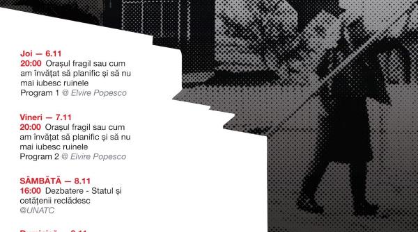 Dezbaterea Statul și cetățenii reclădesc va avea loc sâmbătă, 8 noiembrie, ora 16:00, la Sala Cinema - UNATC și își propune să analizeze reprezentările oficiale din filmele de arhivă și rolurile atribuite cetățenilor în procesul de reconstrucție. Cum își construiește statul imaginea în momente de criză? Invitații dezbaterii sunt Luciana Jinga, Institutul de Investigare a Crimelor Comunismului și Memoria Exilului Românesc, Adrian Deoancă, antropolog, Institutul de Antropologie „Francisc Rainer”, iar discuția va fi moderată de arhitecții Irina Tulbure și Alex Axinte, împreună cu curatorii programului, Andrei Rus și Ana Szel.