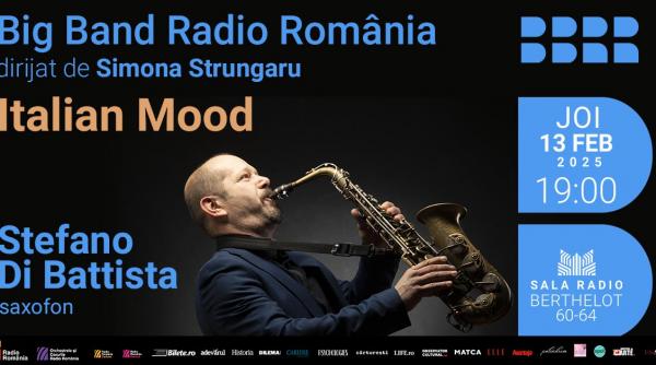 Joi, 13 februarie 2025 (de la 19.00), vă invităm la Sala Radio la „ITALIAN MOOD”, concert prezentat de BIG BAND-UL RADIO dirijat de SIMONA STRUNGARU. Invitat special al serii este saxofonistul italian STEFANO DI BATTISTA, artist de talie mondială, ce se va afla pentru prima oară alături de Big Band-ul Radio România. Seara de la Sala Radio vă propune un repertoriu variat, de la compoziții originale la standarde de jazz și cântece italienești cunoscute, interpretate în maniera jazzistică.