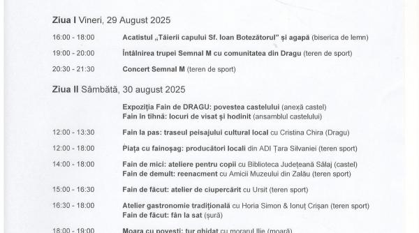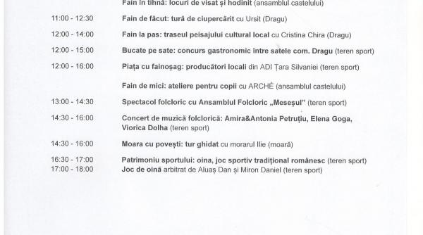 Fain de Dragu este un eveniment deschis pentru toate varstele, care va incepe sambata cu un tur ghidat la pas al peisajului cultural local, urmat de deschiderea targului de producatori locali din Tara Silvaniei - „Piata cu fainosag”. Intre timp, copiii isi pot petrece timpul in preajma castelului, alaturi de Asociatia Amicii Muzeului din Zalau si de reprezentantii Bibliotecii Judetene I.S. Badescu, unde vor descoperi povestea serioasa povestita neserios a patrimoniului si istoriei locului. Experienta va fi completata de o sesiune de reenactment istoric, o forma creativa de educatie si arheologie experimentala. Dupa-amiaza va fi intesata cu ateliere pentru curiosi, de la ciupercarit cu Dan Olar, cunoscut ca Ursit, la gastronomie locala traditionala cu Horia Simion, Ionut Crisan si Mircea Groza, un atelier de facut fan cu unul dintre localnicii comunei si un tur ghidat al Morii cu Valturi din Dragu, care va fi si gazda unei expozitii de arta contemporana. Asfintitul va veni cu vibratii muzicale electrizante aduse de CORBU si invitatii sai, atat live in parcul din jurul castelului, cat si intr-o petrecere de dans „ca pe vremuri” - o discoteca de pe casete audio, in sura cunoscuta in sat ca „La Iovucu lui Zaharie” sau „La Emil al lui Fechete de pe fata”. Iar Dan Ursit isi va pune palaria de povestitor si va impartasi patanii si snoave in jurul focului de tabara din parc.