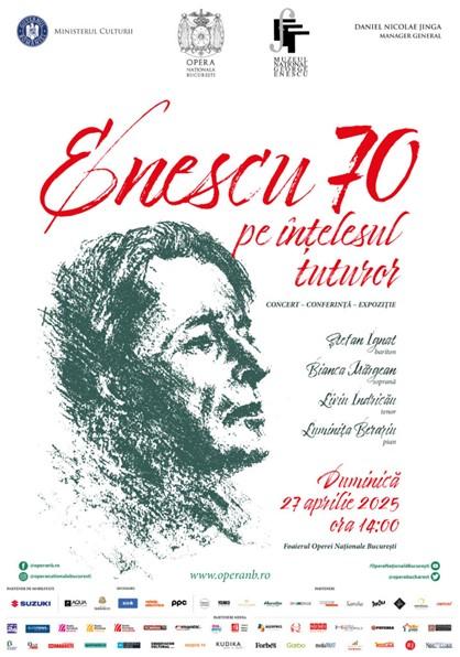 Cu ocazia împlinirii, în 2025, a 70 de ani de la trecerea în eternitate a compozitorului George Enescu, Opera Națională București îl omagiază printr-un concert, dublat de o expoziție-conferință: Enescu 70 pe înțelesul tuturor. Acest eveniment special va prezenta opera monumentală Oedipe într-un format accesibil și captivant, evidențiind conexiunile profunde dintre capodopera enesciană și tradițiile folclorice românești. Figură emblematică a muzicologiei secolului XX, George Enescu a reușit să îmbine esența folclorului românesc cu limbajul muzicii clasice, lăsând în urmă o moștenire impresionantă ca violonist, pianist, dirijor, compozitor și pedagog. Opera sa continuă să inspire generații de muzicieni și iubitori ai artei sunetelor, iar proiectul Enescu 70 pe înțelesul tuturor își propune să aducă în atenția publicului frumusețea și complexitatea creațiilor sale. Interpretează (în Foaierul Operei Naționale București): Ștefan Ignat, Bianca Mărgean și Liviu Indricău. Acompaniază la pian: Luminița Berariu.