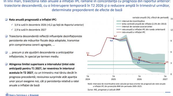 Ținta rămâne 2,5% ±1 pp. Iar proiecția indică 3,9% la finalul lui 2026 și 2,9% în decembrie 2027.