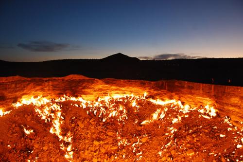 Darwaz - craterul de gaz din Deşertul Karakum, Turkmenistan. Forările întreprinse în 1971, pentru a capta gazele naturale, s-a soldat cu un eşec de proporţii. De atunci, în acest loc nu mai calcă nici oamenii şi nici iarba nu mai creşte. De atunci au trecut 38 de ani. Natalja Argint ne înfăţişează peisajul din prezent.