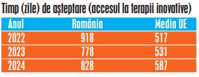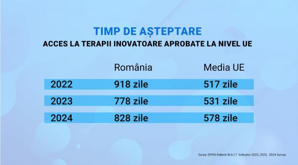 Timpul de așteptare al pacienților din România nu a scăzut niciodată sub borna de doi ani în ultimele Studii W.A.I.T., începând cu cel din 2020. În studiile anterioare pacienții români au așteptat după cum urmează: 778 de zile (Studiul W.A.I.T. 2023), 918 zile (Studiul W.A.I.T. 2022), 899 de zile (Studiul W.A.I.T. 2021) sau 883 de zile (Studiul W.A.I.T. 2020). Din 173 de medicamente inovatoare care au primit aprobare din partea Agenției Europene a Medicamentelor (EMA) în perioada 2020-2023, în România erau disponibile, la 5 ianuarie 2025, doar 33 de medicamente. Niciun medicament aprobat la nivel european în 2023 nu era compensat în România la 5 ianuarie 2024. În acest nou raport, rata de disponibilitate a medicamentelor este de doar 19%, în creștere cu doar două procente față de studiul similar de anul trecut. Datele arată că în topul țărilor cu cea mai mare rată de disponibilitate se situează Germania (90%), urmată de Italia (83%) și Austria (82%), iar țările vecine sau comparabile cu România se situează mult în fața noastră: Bulgaria (53%), Polonia (39%), Ungaria (27%). Alte date relevante ale studiului: