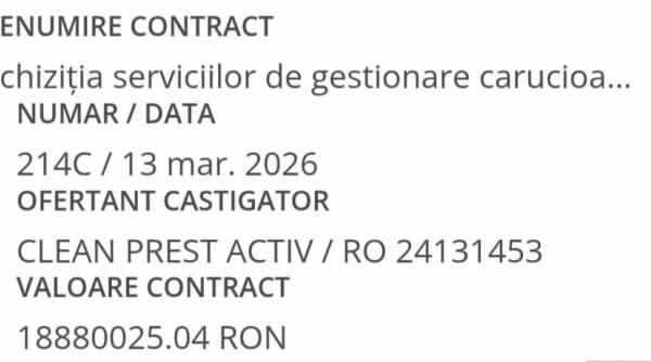 Afacerea e simplă și bănoasă pentru câștigător: „Aeroporturi București” achiziționează „servicii de gestionare a cărucioarelor de bagaje cu personal manevrant și manipulare și/sau depozitare a încărcăturilor”. Mai clar, SRL-ul trebuie să aibă grijă de cărucioarele de transport bagaje puse la dispoziție de CNAB. Cum? Pentru 18,8 milioane de lei, astfel: prin „manevrare, (colectare/recuperare, repoziționare etc.) și manipulare cu personal manevrant a 1.000 bucăți cărucioare de bagaje puse la dispoziție de beneficiar (proprietatea beneficiarului) destinate transportului obiectelor pasagerilor (bagaje, genți etc.) în perimetrul aeroportuar, respectiv preluarea acestora din parcări, terminale, drumuri acces etc. și depozitarea acestora în locurile special amenajate cu această destinație, aferente terminalelor de pasageri - zone publice, zone restricționate, alte spații (filtre, ghișee, parcări, drumuri, trotuare/peroane etc.) aparținând CNAB S.A”.