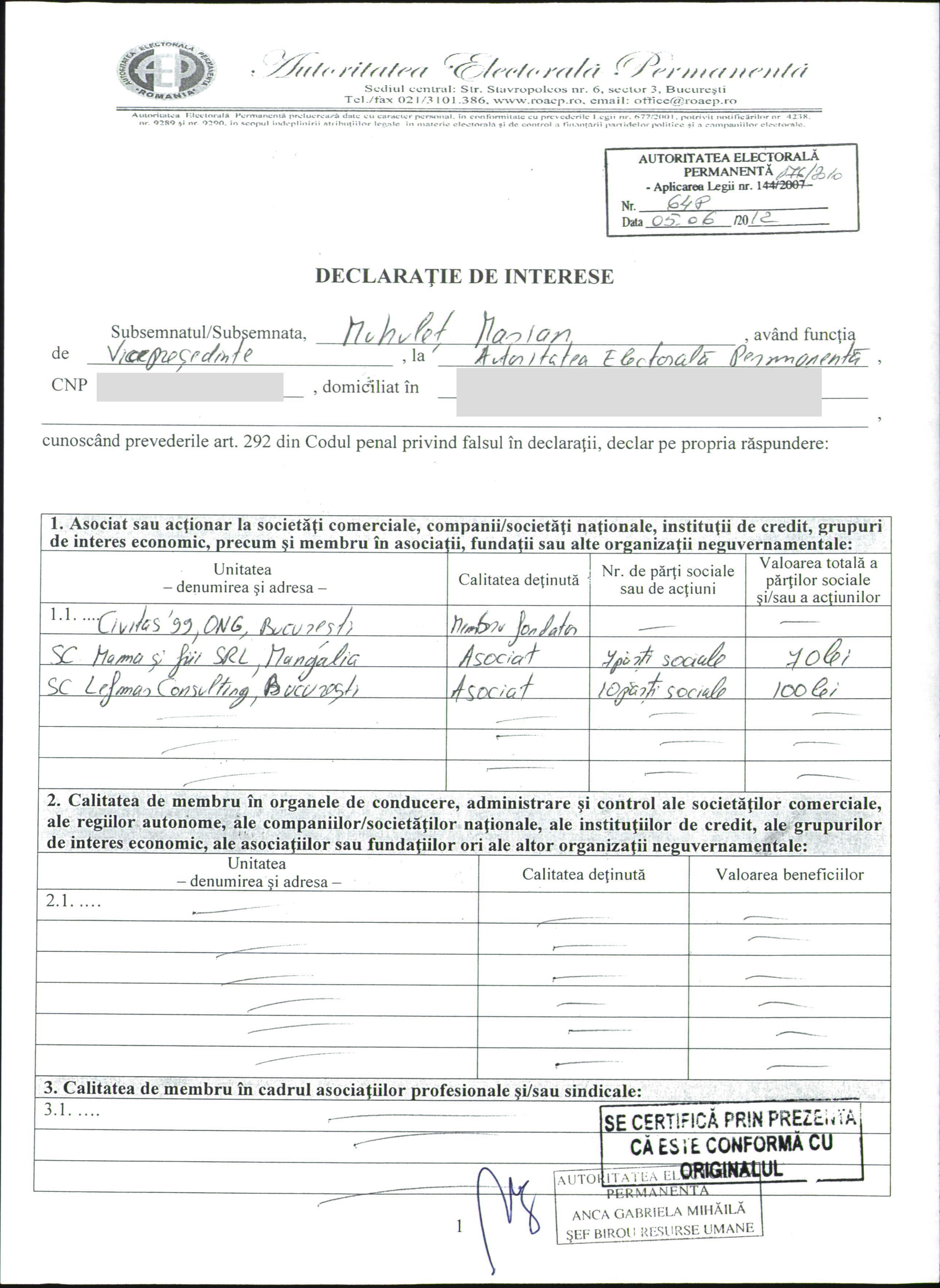 Iuiana Leferman deține, la rândul ei, acțiuni în cadrul firmei Leferman Consulting SRL. Surpriza abia acum apare, când, studiind acționariatul acestei societăți, descoperim că al doilea asociat se numește Marian Muhuleț, care a deținut, până anul trecut, funcția de vicepreședinte al Autorității Electorale Permanente, fiind înlocuit, în 2014, de Victor Ponta. Marian Muhuleț este cunoscut opiniei publice, având în vedere că, la toate scrutinurile de alegeri, el este cel care prezintă rezultatele prezenței la vot sau rezultatele parțiale și finale centralizate de Biroul Electoral Central.