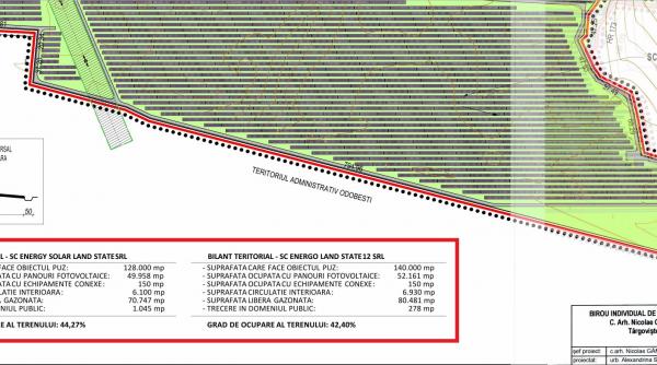 În ceea ce privește SC Energo Land State 12 SRL, suprafața totală era de 140.000 de metri pătrați, suprafața ocupată cu panouri fotovoltaice de 52.161 metru pătrați, suprafața ocupată cu echipamente conexe de 150 metri pătrați, suprafața circulației interioare de 6.930 metri pătrați, suprafața loberă gazonată de 80.481 metri părați și trecerea în domeniul public de 278 metri pătrați. Procentul de ocupare a terenului era de 42,8%.