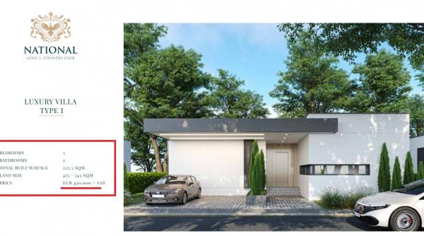 Conform site-ului oficial al National Golf & Country Club, la secțiunea imobiliare, subsecțiunea „Vile de lux”, sunt publicate și prețurile acestor imobile. Cel mai ieftin, poate fi achiziționat un astfel de imobil pentru 450.000 de euro, la care se adaugă TVA de 19%. Sunt nouă tipuri de vile.
