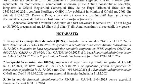 Astfel, „se aprobă, cu unanimitate de voturi (80%) situațiile financiare ale CNAB la data de 31 decembrie 2024”, „se aprobă, în unanimitate (100%) propunerea de repartizare a profitului înregistrat de CNAB la data de 31 decembrie 2024”. „Se ia act de Raportul administratorilor prin exercițiul financiar încheiat la 31 decembrie 2024 și de raportul auditorului independent privind situațiile financiare la 31 decembrie 2024” și „se ia act de încetarea mandatului de administrator al domului Ardelean Felix Corneliu, urmare a deciziei acestuia din 6 mai 2025”. Tot atunci, Consiliul de Administrație al Companiei Naționale de Aeroporturi București a amânat numirea unui nou administrator provizoriu, pentru o ședință ulterioară.