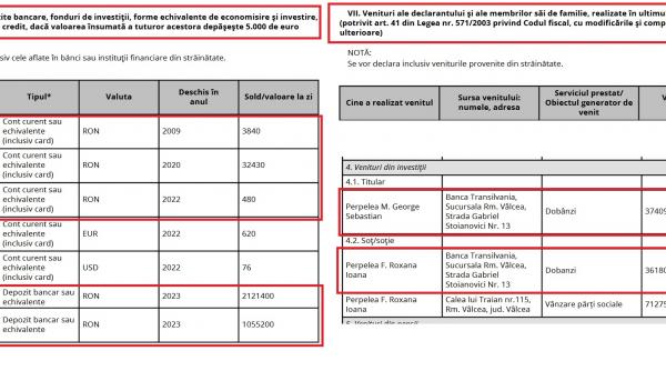Un detaliu extrem de interesant rezultă din rubrica activelor financiare menționate în document citat. Concret, Sebastian George Perpelea notează că avea, la acel moment, în conturi și depozite bancare, economii totale în cuantum de 3.213.350 de lei, 620 de euro și 76 de lei.