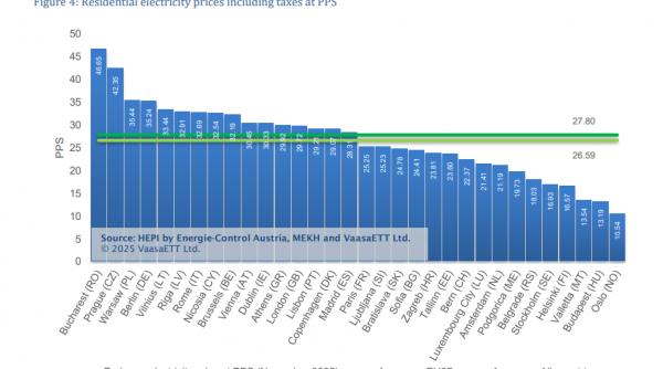 Atunci când sunt ajustate la standardele puterii de cumpărare (purchasing power standard - PPS) din fiecare țară, imaginea se schimbă dramatic. Cele mai mici prețuri ajustate la energia electrică pentru gospodării se găsesc în Oslo, Budapesta, Valletta și Helsinki (la fel ca în octombrie), în timp ce cele mai mari au fost în București, Praga, Varșovia și Berlin (și aici se păstrează clasamentul). Majoritatea țărilor din Europa Centrală și de Est ajung de obicei la prețuri ale energiei electrice relativ scăzute în comparație cu nivelul general al prețurilor din țară și sub media europeană, arată raportul. București, Praga, Riga, Vilnius și Varșovia sunt singurele capitale dintre țările din Europa Centrală și de Est în care prețul energiei electrice a fost peste media europeană în noiembrie 2025. Puterea de Cumpărare Standard (PPS) reprezintă moneda de referință stabilită la nivelul Uniunii Europene pentru a exprima rezultatele Programului European de Comparare. PPS este o unitate de valută convențională care exclude influența diferențelor între nivelul prețurilor dintre țări.