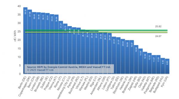 Capitalele Berlin și Copenhaga au fost în noiembrie cele mai scumpe orașe pentru clienții casnici din Europa, urmate de Berna, Londra și Bruxelles. Kievul a avut cel mai ieftin preț la electricitate, urmat de Budapesta, Belgrad și Podgorica. În termeni nominali, prețurile din capitalele Europei Centrale și de Est (CEE) au fost mai mici decât media și în noiembrie. Totuși, în această lună, București, Praga și Vilnius sunt singurele capitale dintre țările CEE în care prețul energiei electrice este peste media europeană.