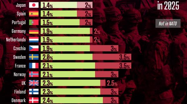 În urma recentului summit NATO de la Haga, statele membre ale alianței militare au semnat un nou angajament prin care aliații își mărească cheltuielile pentru apărare la 5% din PIB până în 2035, excepție făcând doar Spania. Cei 5% ar urma să fie împărțiți în 3,5% pentru pregătire militară și 1,5% pentru cibernetică și infrastructură. Aceasta reprezintă o creștere semnificativă față de obiectivul anterior de 2% și un obiectiv pe care președintele american Donald Trump l-a promovat ca parte a eforturilor sale de a-i determina pe aliații europeni să suporte o mai mare parte din costul propriei apărări.