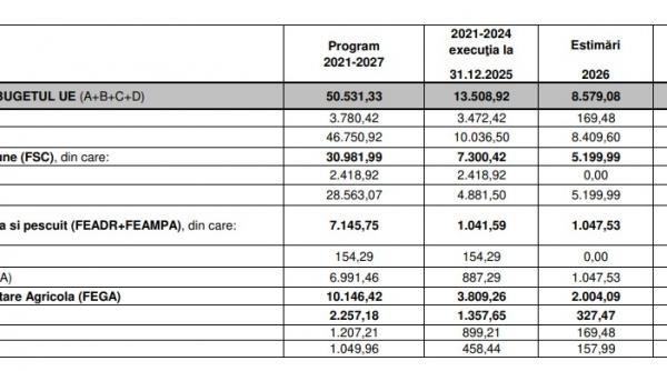 Potrivit centralizării realizate de către Ministerul Investițiilor și Proiectelor Europene, la 30 ianuarie 2026 niciunul din proiectele derulate în cadrul Politicii de Coeziune 2021-2027 nu avea un grad de absorbție care să atingă măcar 50%. Cel mai bine stăm la atragerea fondurilor alocate transporturilor, unde ne apropiem de un grad de 50%, iar cel mai prost stăm la programul de digitalizare, unde am atras ceva mai puțin de 15% din fonduri. Gradul de absorbție al celor opt programe se prezintă astfel: